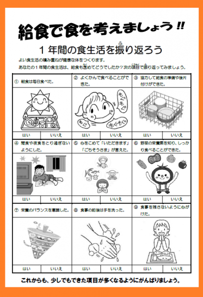「給食で食を考えましょう!!」はこちらをクリックするとご覧いただけます。今月号では、「1年間の食生活を振り返ろう」とのタイトルのチェックシートになっています。一度、各自でチェックをしてみましょう。また、これからも、少しでもできた項目が多くなるようにがんばりましょう。