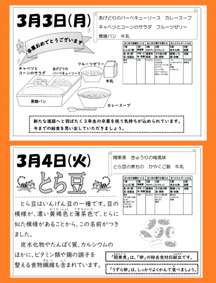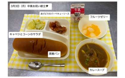 本日の給食は、卒業お祝い献立です。「あげどりのバーベキューソース・カレースープ・キャベツとコーンのサラダ・フルーツゼリー・黒糖パン・牛乳」が提供されます。給食に関わっていただいているすべての方々に、感謝の気持ちをもって、しっかり給食をいただきましょう。