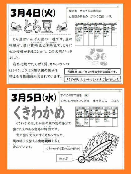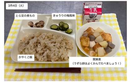 本日の給食は、「関東煮【除去食:卵】・きゅうりの梅風味・とら豆の煮もの・かやくごはん・牛乳」が提供されます。「関東煮」は卵の除去食が提供されます。該当する生徒の皆さんは、指定のカードをもって調理室まで受け取りに行きましょう。