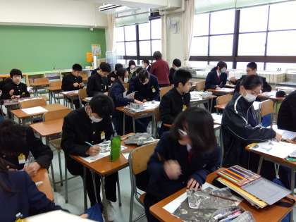 1年美術:インクのマーブル模様を切り取って作品を作成しています。