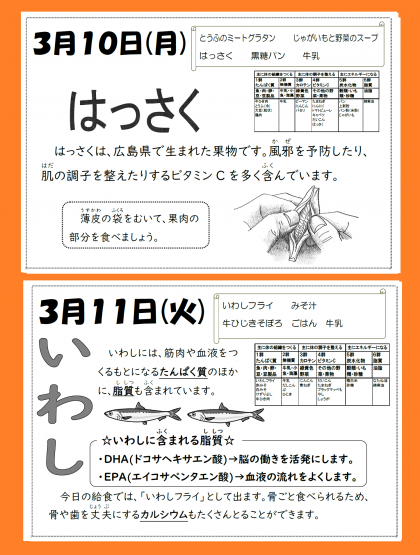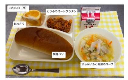 本日の給食は、「とうふのミートグラタン・じゃがいもと野菜のスープ・はっさく・黒糖パン・牛乳」が提供されます。給食をしっかりいただいて、健康の保持増進に努めましょう。
