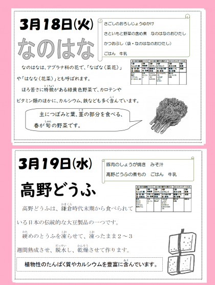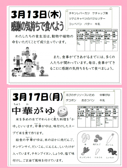 本日の給食は、「チキンレバーカツ・ケチャップ煮・ツナとキャベツのバジルソテー・コッペパン・バター・牛乳」が提供されます。給食をしっかりいただいて、健康の保持増進に努めましょう。