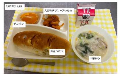 本日の給食は、「えびのチリソースいため・中華がゆ・デコポン・おさつパン・牛乳」が提供されます。給食をしっかりいただいて、健康の保持増進に努めましょう。