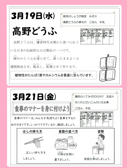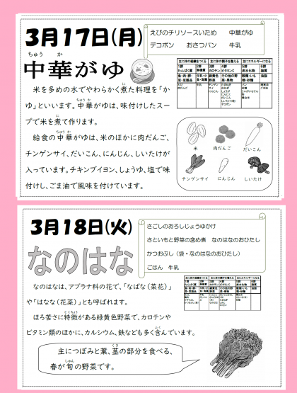 明日は「さごしのおろしじょうゆかけ・さといもと野菜の含め煮・なのはなのおひたし・かつおぶし(袋・なのはなのおひたし)・ごはん・牛乳」が提供されます。1・2年生のみなさん、給食も残り4回です。給食に携わっていただいている方々に感謝の気持ちをもって、しっかりといただきましょう。