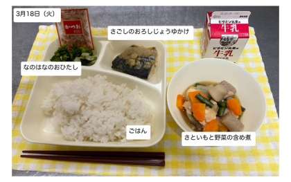 本日の給食では、「さごしのおろしじょうゆかけ・さといもと野菜の含め煮・なのはなのおひたし・かつおぶし(袋・なのはなのおひたし)・ごはん・牛乳」が提供されます。給食をしっかりいただいて、健康の保持増進に努めましょう。