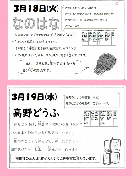 明日は「豚肉のしょうが焼き・みそ汁・高野どうふの煮もの・ごはん・牛乳」が提供されます。1・2年生のみなさん、給食も残り19日(水)と21日(金)です。給食に携わっていただいている方々に感謝の気持ちをもって、しっかりといただきましょう。