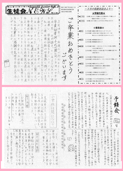 表面「ご卒業おめでとうございます」の見出しの記事は、在校生代表として参列したことのレポート。裏面では「予餞会」「小学校訪問」についてのレポートが掲載されています。