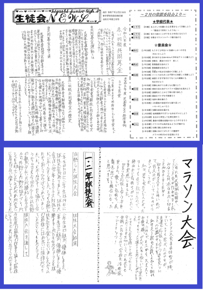 表面では「赤い羽根挙動募金」についての記事。裏面では「マラソン大会」と「球技大会」のレポートが掲載されています。