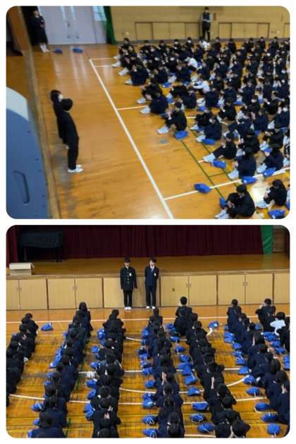 3月19日(火)、1年生最後の朝の学年集会をしました。各クラスの学級代表が前に立ち、自分のクラスのいい所を紹介し、2年生への決意をスピーチしました。しっかりとしたスピーチ後には、暖かな拍手が贈られました。