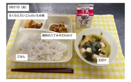 本日の給食は、本年度最後の給食となりました。「鶏肉の八丁みそだれかけ・五目汁・ちくわとだいこんのいため煮・ごはん・牛乳」が提供されます。