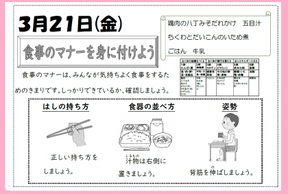 1・2年生のみなさん、給食に携わっていただいている方々に感謝の気持ちをもって、しっかりといただきましょう。