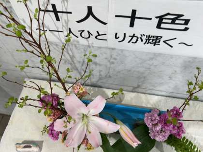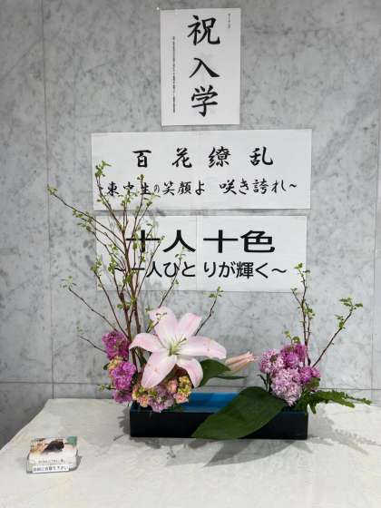 新年度のスタートに合わせて玄関のお花を生け替えていただきました。ありがとうございました。今年度もよろしくお願いします。お題は『光集めて』、お花は『黄金葉・ユリ・ストック』です。生徒たちの光を集めて、また、スタッフの光を集めて、光輝く東中となるようにと願います。