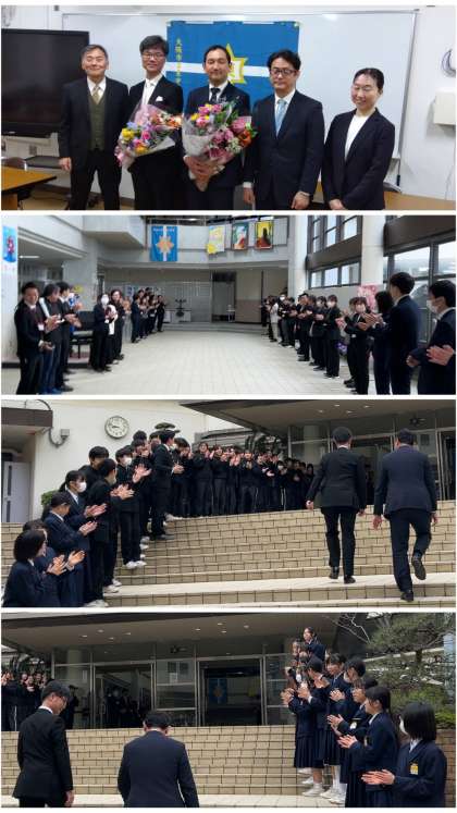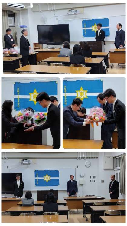 新副校長先生と新教頭先生が、たくさんの生徒たちが待ち受けてくれた正門をくぐり、大きな拍手をいただき、着任されました。教職員へのご挨拶、なにわ会、PTA役員の皆さまへのご挨拶に続いて、それぞれのご代表の方から、ご栄進への祝辞、並びに花束をいただきました。お忙しいところ、ご出席いただきありがとうございました。