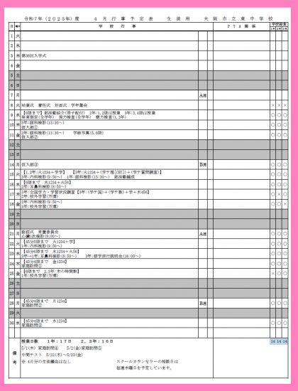 4月の行事予定表を掲載します。こちらをクリックするとご覧いただけます。また、画面上部のタブ『行事予定』をクリックしてもご覧いただけます。↓