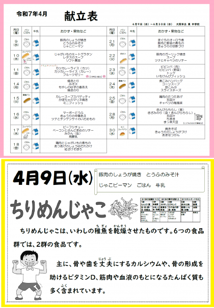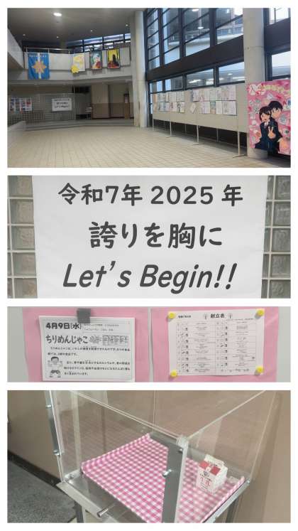新年度の給食が、本日4月9日(水)から始まります。給食当番の人はエプロンと三角巾(バンダナ可)、マスクを用意してください。すべての生徒の皆さんは、ランチョンマットとマスクの用意をお願いします。