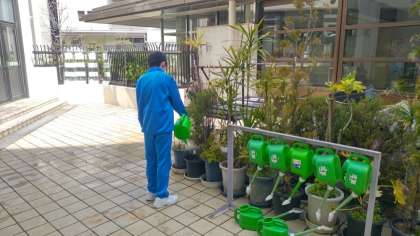 2枚目は、わかくさ学級の取組で、植栽への水やりを丁寧にする生徒。