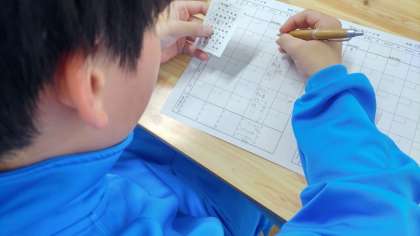 3枚目は、ウイークリーメモ(連絡帳)への記入の仕方を教わる1年生、です。
