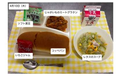 本日の給食では、「じゃがいものミートグラタン・レタスのスープ・ソフト黒豆・コッペパン・いちごジャム・牛乳」が提供されます。しっかりといただいて、健康の保持増進に努めましょう。