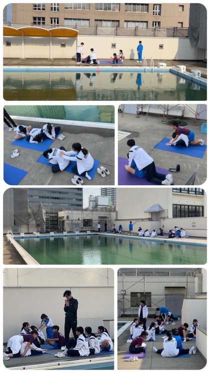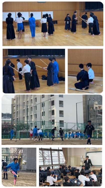 水泳部はプールサイドで、剣道部は4階の多目的室での活動です。サッカー部は、グランドコンディションが悪く、ミーティングの後、1年生は靴が汚れるので、見学しています。
