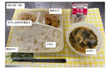 本日の給食では「焼きとり・みそ汁・もやしのゆずの香あえ・焼きのり・・ごはん・牛乳」しっかりと給食をいただいて、健康の保持増進に努めましょう。