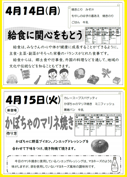 明日は「カレースープスパゲッティ・かぼちゃのマリネ焼き・ミニフィッシュ・黒糖パン・牛乳」が提供されます。お楽しみに。