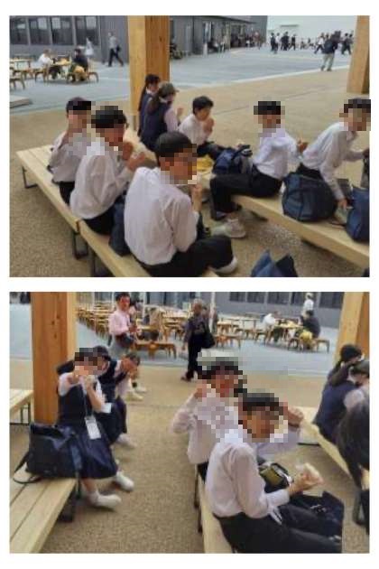 大回廊の下で、早速にお昼ごはんです。保護者の皆さま、おにぎりなど食べやすい昼食の用意をありがとうございました。