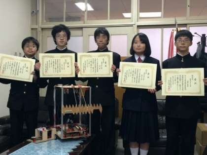 本日の放課後、技術部の全国出場メンバーが校長室にて報告会を行いました。一人一人が大会の結果と感想を報告した後、校長先生から『大会で得た経験を糧に、今後の学校生活に活かしていきましょう。お疲れ様でした。』と慰労していただきました。最後に出場ロボットとともに記念撮影をしました。