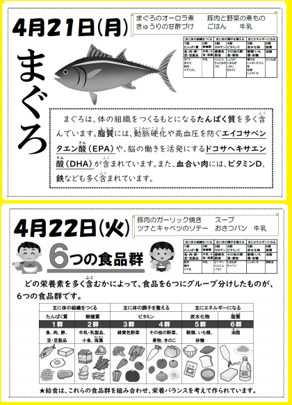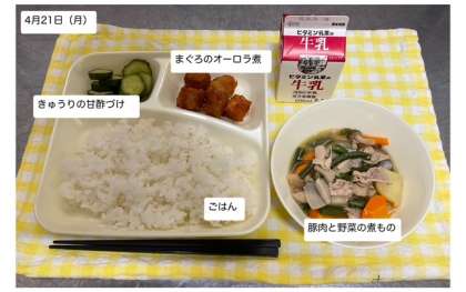 本日の給食では「まぐろのオーロラ煮・豚肉と野菜の煮もの・きゅうりの甘酢づけ・牛乳」が提供されます。しっかりと給食をいただいて、健康の保持増進に努めましょう。