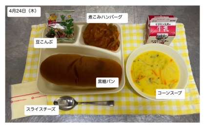 本日の給食では「煮こみハンバーグ・コーンスープ・豆こんぶ・スライスチーズ・黒糖パン・牛乳」が提供されます。しっかりと給食をいただいて、健康の保持増進に努めましょう。