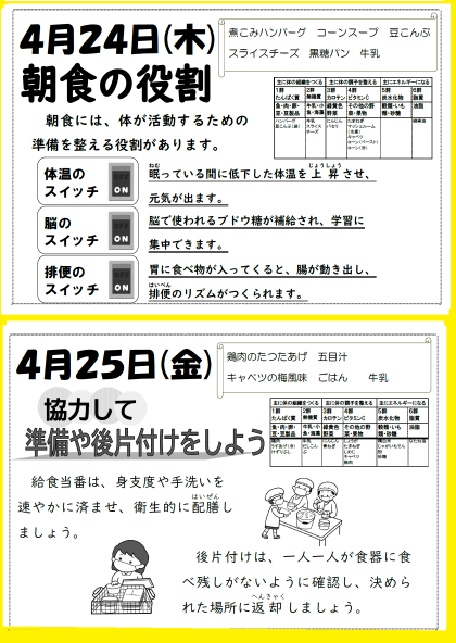 明日2・3年生には「鶏肉のたつたあげ・五目汁・キャベツの梅風味・ごはん・牛乳」が提供されます。お楽しみに。