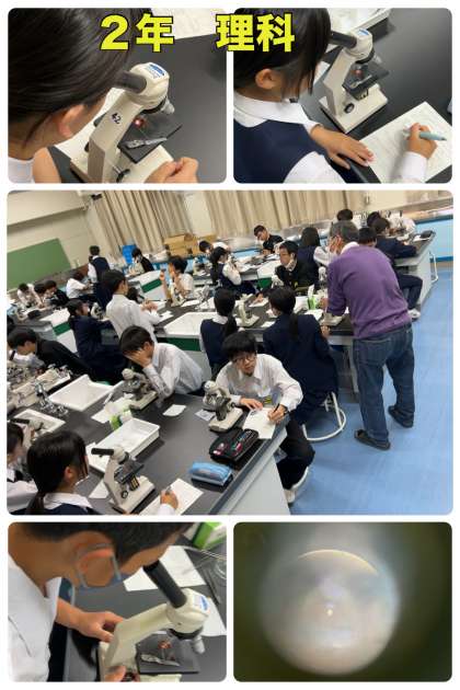新しい校舎の3階にある理科室。一人一台の顕微鏡を使って細胞の観察をしています。顕微鏡の光源には一台ずつにライトを付けられるように改良しています。理科室の器具等は、大阪市教育委員会からの整備に加えて、地域の財団のご支援をいただいています。東中生の教育環境の充実にご理解とご協力をいただきありがとうございます。