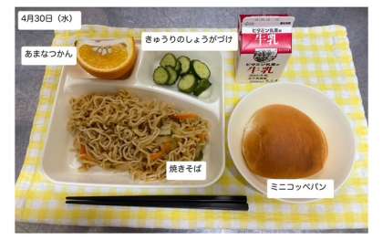 本日の給食では「焼きそば・きゅうりのしょうがづけ・あまなつかん・ミニコッペパン・牛乳が提供されます。しっかりと給食をいただいて、健康の保持増進に努めましょう。