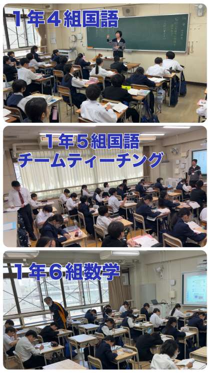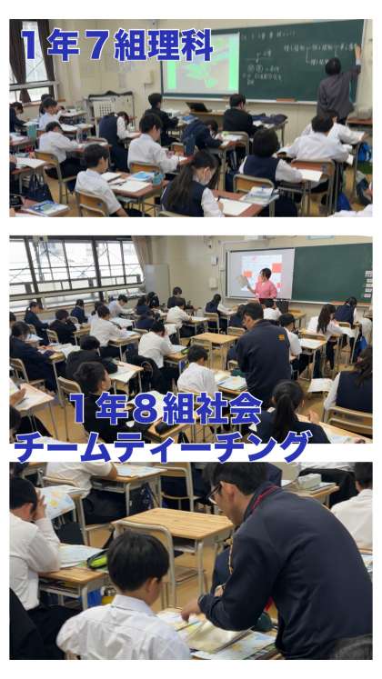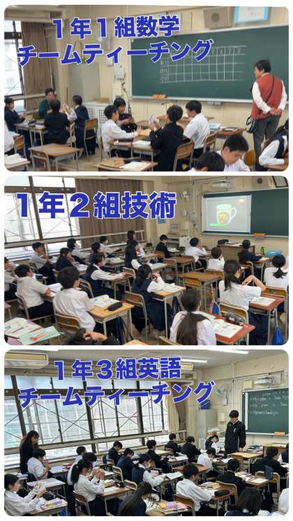 1年生の授業では、1コマの授業を複数の先生で担当する授業形態を積極的に取り入れています。全ての授業とはいきませんが、国語・数学・英語に理科と社会、そして、家庭科の授業で取り組んでいます。東中では、先生方が創意工夫を凝らした授業づくりに取り組み、『No child will be left behind!』(誰も取り残さない)教育を進めています。