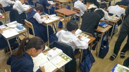 1枚目の写真は、1年生の理科の授業です。課された問題について教科書を読みこんで考え、答えを作成しています。スタートすると、みんなが教科書にかじりつくようにして読解力を発揮し、答えを作文していました。