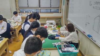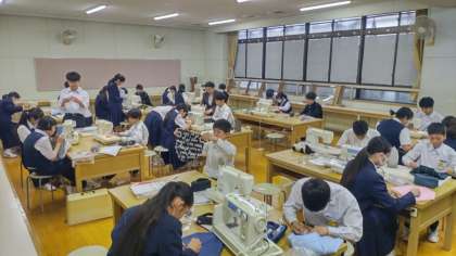 1枚目の様子は、弁当袋をミシンで作成している様子です。きれいにできていた生徒に声をかけると「小学校でもやりましたから」と、胸を張って答えてくれました。「小物入れにして修学旅行でも持っていけます!」というコメントも。お気に入りの一枚が出来上がるといいですね。