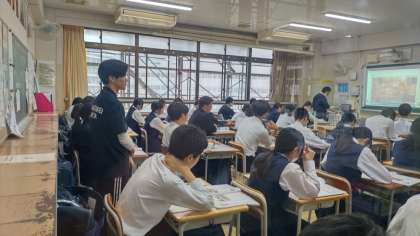 3枚目は英語の授業の様子です。教室の後ろには、近隣の大学から来た学生が写っています。このように東中には、年間を通してたくさんの大学生が実習に来ています。