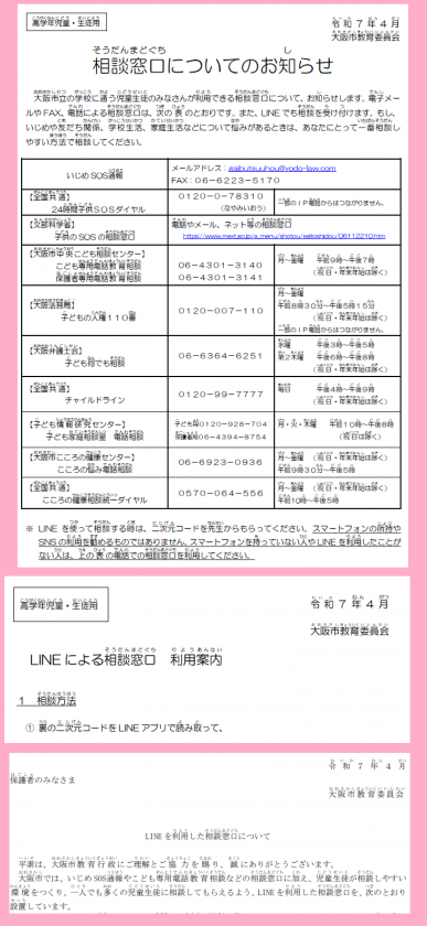 また、これまでもお伝えしていますように、教育委員会から各相談窓口がら紹介されています。必要に応じて利活用してください。