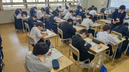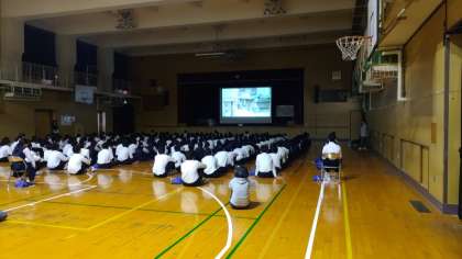 1枚目は、3年生の平和学習の様子です。来月の修学旅行で広島方面に向かうとあって、広島の原爆投下に関する映画を見て平和についての学びを深めています。刺激的な場面もありましたが、現実にはもっと恐ろしい状況を人々が直面していたことに、改めて驚きとともに、戦争を繰り返さないという強い意志を固めてくれていました。