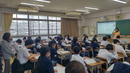 2枚目は、2年生の総合的読解力育成カリキュラムについての授業です。昨年度から段階的に導入されたプログラムを、教育委員会もバックアップし、昨年度は教材の配信が、今年度は画面に投影して目からも読解を支援する補助教材の配信が行われています。
