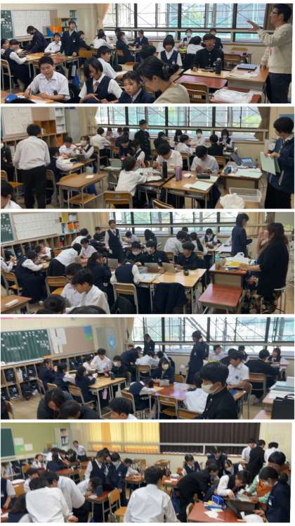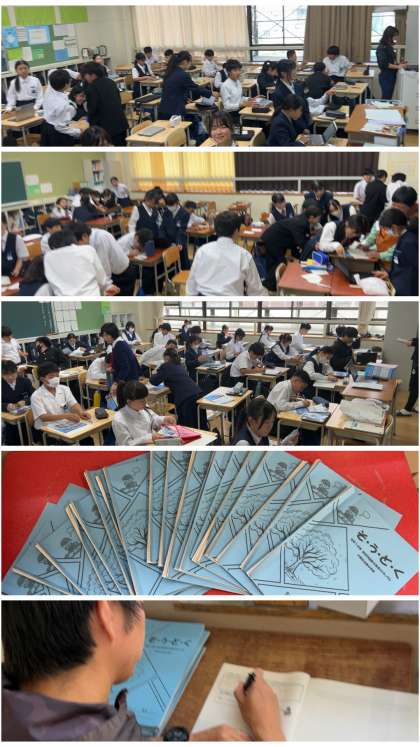 教室の写真は1年生の学級活動の様子です。班ごとでの活動を通して、仲間づくりも進められています。また、廊下では、『そうどく』に取り組んだ生徒たちのワークブックにコメントを書いている先生の姿がありました。