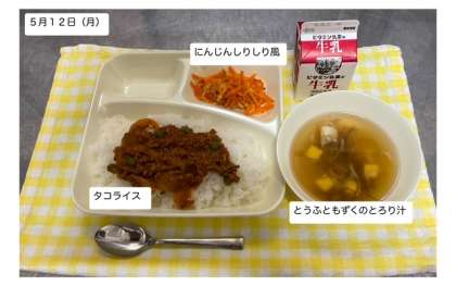本日の給食では「タコライス・とうふともずくのとろり汁・にんじんしりしり風・牛乳」が提供されます。しっかりと給食をいただいて、健康の保持増進に努めましょう。