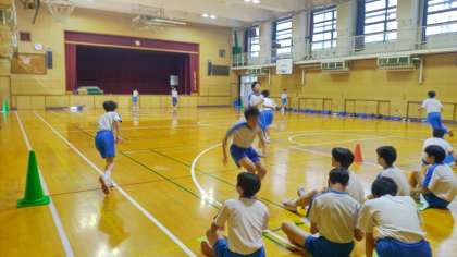 男子生徒はシャトルランに挑戦です。一定のリズムのうちに、20メートルを何度走り切れるかを測定する、体力テストの種目の一つです。はじめはゆっくり余裕がありましたが、だんだんとリズムが早くなっていきます。走り切った後はすぐに方向転換しないと次の20メートルを走り切れなくなるので、走る速さだけでなく、途中の反転速度も重要です。