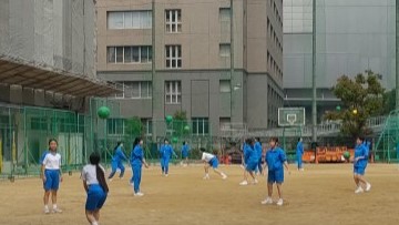 女子生徒はバレーボールに挑戦です。アンダーハンドパス、オーバーハンドパスを駆使しながら、1対1を基本に取り組んでいました。ほかのクラスでは、勢い余って工事現場にボールが飛び込むこともあったと聞きましたが、このクラスは誰もが自分の持っている技術を生かして丁寧に練習していました。
