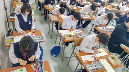 慎重に輪郭を描いてから塗る人もいれば、何色も使ってひまわりやパンダ、富士山に挑戦背板利する生徒もいました。