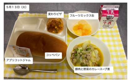 本日の給食では「豚肉と野菜のカレースープ煮・変わりピザ・ミックスフルーツ(缶)・コッペパン・アプリコットジャム・牛乳」が提供されます。給食の変わりピザは、ぎょうざの皮に新食品の「乳なしチーズ」とツナ、コーン、ピーマン、ピザソースを混ぜ合わせた具をのせ、焼き物機で焼いています。なお、乳なしチーズは、米粉などから作られたものです。乳製品が含まれていないので、乳アレルギーがある人も食べることができます。しっかりと給食をいただいて、健康の保持増進に努めましょう。
