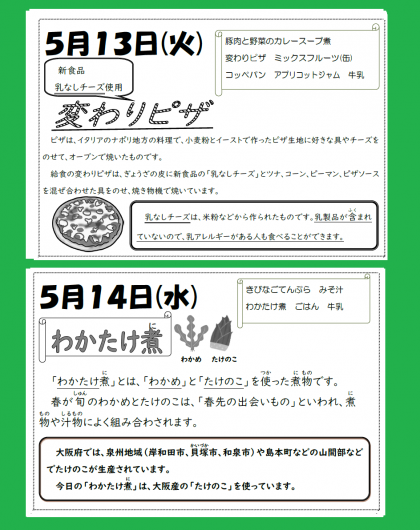 明日は、「きびなごてんぷら・みそ汁・わかたけ煮・ご飯・牛乳」が提供されます。お楽しみに。