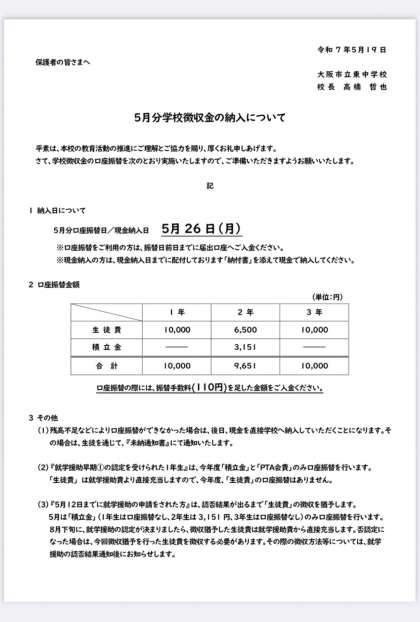 本日、ミマモルメで配信しました「5月分の学校徴収金の納入」について、お知らせします。口座振替日前日までに届出口座へご入金ください。