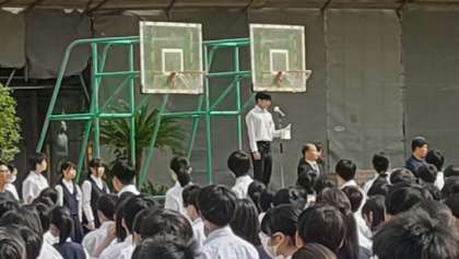 屋外で全校集会をするのは、避難訓練の一環でもあります。日々の学習活動の中に、いざいう時に自分の命を守る行動がありますよ、というのは先週の避難訓練の時にも合ったお話です。今日の全校集会もいつも通り、素早く、また静粛に集まることができました。