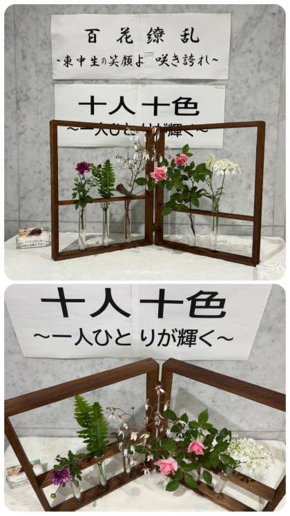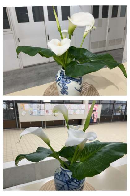青空が広がり、夏めく(新緑が増え、夏の気配が感じられるようになった)日となりました。玄関のお花のお題が『夏めく』、お花は『雪の下・小菊・バラ・レースフラワー・玉しだ』。玄関ロビーには『カラー(花と葉)』、職員室前には『ミニバラ』を「自宅に咲きました」、と添え書きをいただきました。東中では、お二人の方にお花を生けていただいています。いつもありがとうございます。生徒の皆さん、生花をみて、心を癒し、季節の移り変わりも楽しみましょう。