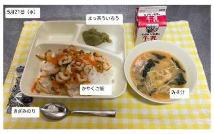本日の給食では「かやくご飯(具)・きざみのり(袋・かやくご飯)・みそ汁・まっ茶ういろう・牛乳」が提供されます。しっかりと給食をいただいて、健康の保持増進に努めましょう。